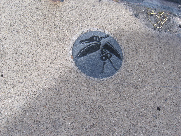 According to the artist’s website, “FOSSILS EXPOSED involves the creation and installation of 150 circular 4.5 inch granite markers. Each represent the artist’s interpretive carvings of local and regional fossilized plant and animal life, which are sandblasted into granite…. The imagery is inspired by the fossil collections from the San Diego Museum of Natural History. Each marker is different, representing various plant and animal species covered over by modern day urban development. The project would encourage awareness of the levels of life that struggled to exist within the area–some in the past, some in the present…”