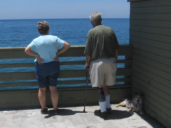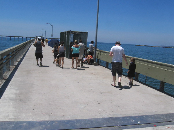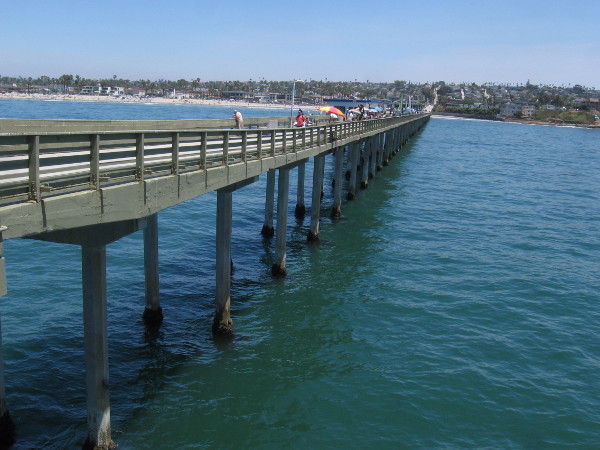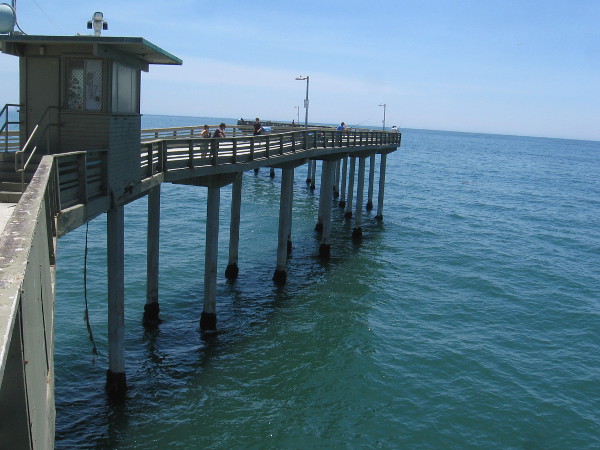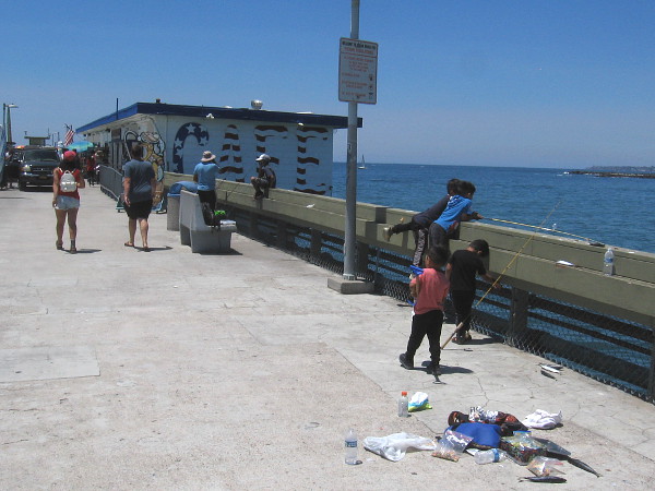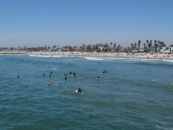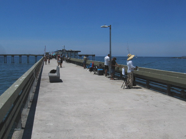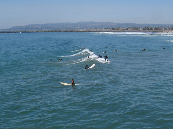 Fishermen were leaning against the rail or sitting on benches hoping to catch the big one. Those strolling down the pier often paused to watch a group of surfers below.
