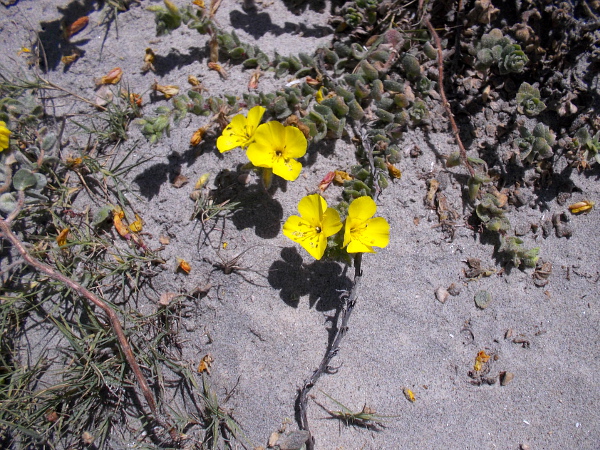 Entrance station at Silver Strand State Beach.The blue Pacific Ocean stretches beyond the seemingly barren western shore of the Silver Strand. Point Loma and a cruise ship can be seen in the distance.The flowers of beach suncup, or evening primrose, are like bright gems on the sand.The Western Snowy Plover depends on kelp and seagrass washed ashore, feeding on insects. Their young are hatched in the sand. Fences keep the feet of beachgoers away.Walking along the San Diego Bay side of the State Park.Coastal strand plants begin to grow past the tide line. Winds and waves sculpt the sands in this dynamic, yet fragile habitat.