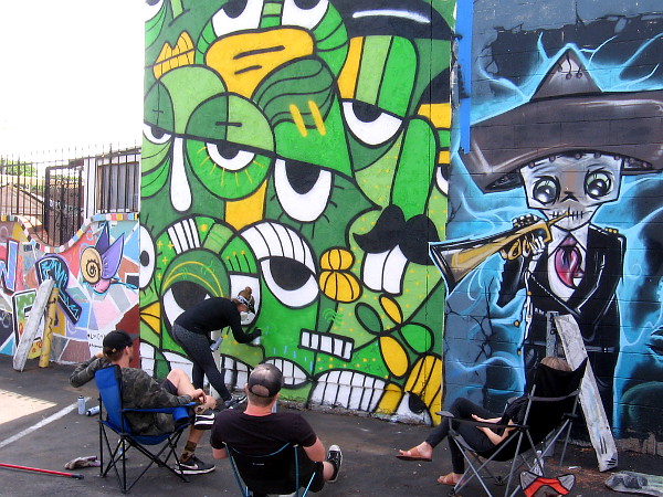 Her work has a unique style of its own, as you can see at the artist’s website here. Sandra Escobar is also a digital artist, and I learned this fun mural, with its crazy jumble of eyes and noses and other facial features, was designed digitally in advance.