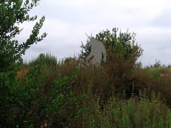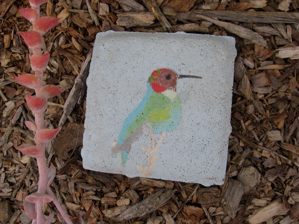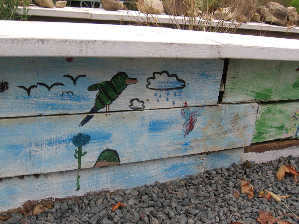All was quiet. The early morning summer breeze was pleasantly cool. The few picnic benches were empty. I saw no other people. But I did see many active birds. And bright flowers. And lots of flourishing native plants including some cacti. And modest planters holding more greenery. And many winding trails. And Bigfoot! Yes, you heard me correctly! And–to my additional delight–a whole lot of nature artwork created by young students, including painted tiles scattered here and there on the ground and a cool mural on a shipping container!