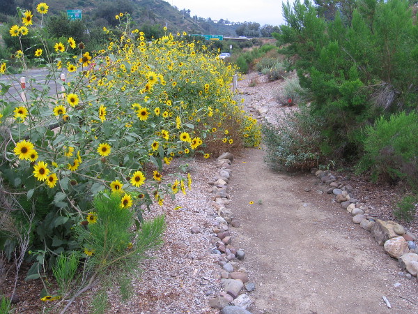 Every so often I drive past this native plant garden, but I never see a place to park. The stretch of Camino del Rio North beside it is mostly used by people going to and from nearby office buildings, and no street parking is available.
