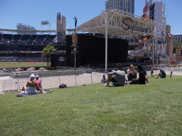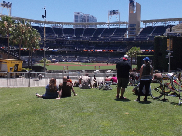 I and a few dozen other fans watched Padres team players get ready for the season in an intrasquad game. We sat on the grassy hill of Gallagher Square, the area beyond the outfield that until December last year was called Park at the Park.
