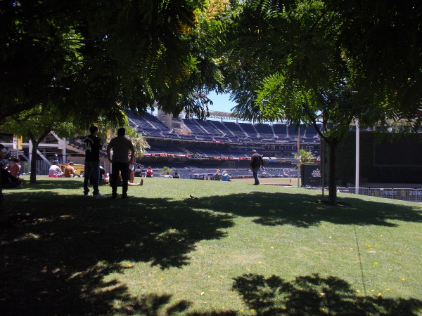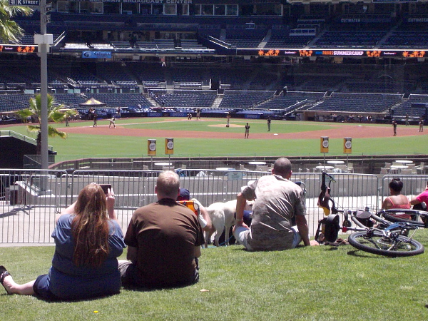 I and a few dozen other fans watched Padres team players get ready for the season in an intrasquad game. We sat on the grassy hill of Gallagher Square, the area beyond the outfield that until December last year was called Park at the Park.