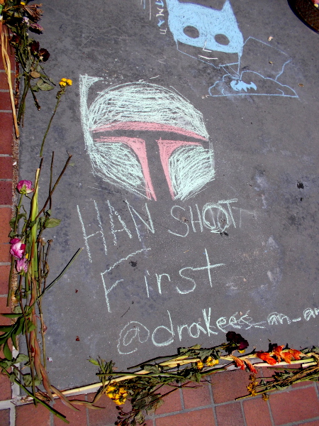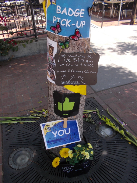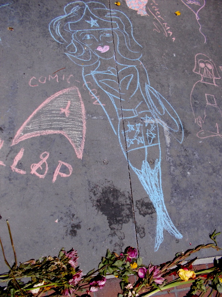 The shrine keeps morphing and growing larger. Today chalk art superheroes and other pop culture characters have appeared in Gaslamp Square!