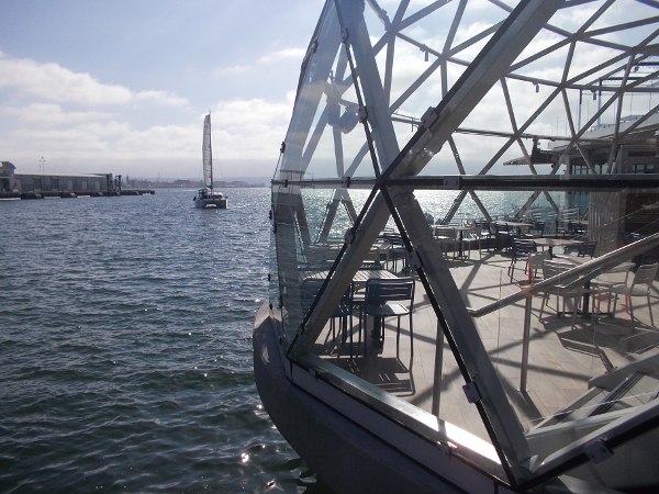 I’ve been watching the construction of this unusual dockside building for well over a year. You might recall I posted some photos late last year here. The Portside Pier is located directly next to the Maritime Museum of San Diego’s historic tall ship Star of India.
