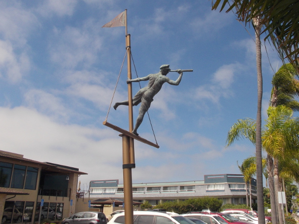 The artwork, by renowned Encinitas-based artists T.J. Dixon and James Nelson, depicts a sailor high atop a ship’s mast holding a spyglass, searching for land. On a plaque at the sculpture’s base is a poem titled Homecoming by John Alger.