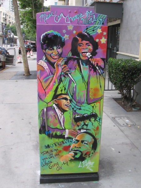 The artwork includes legends of Motown, jazz, blues, pop music, hip-hop, reggae, and rock and roll. You can see them at the corner of Park Boulevard and Market Street.