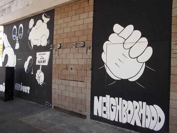 I walked past their boarded-up windows this afternoon and saw a mural had been painted on them. After a little searching on the internet, I see that artists Joshua and Ezra Andrade created the artwork last month.
