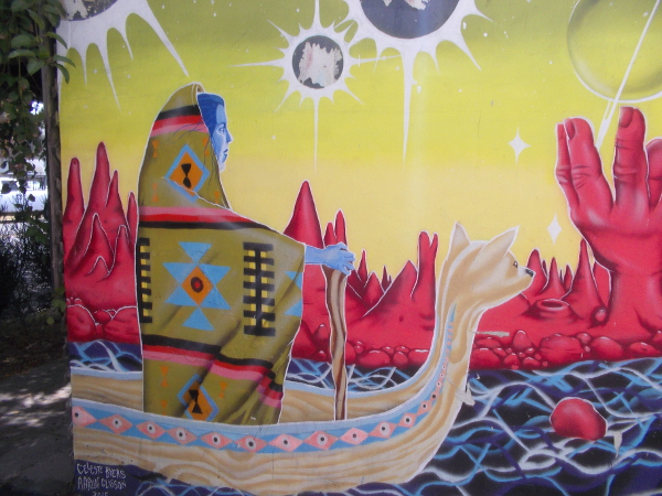 The mural’s title is Journey Within Through the Sea of Soul, and it was painted by Celeste Byers and Aaron Glasson. It’s on the side of the Teros Gallery. The mural depicts the gallery owner riding a Chihuahua ship on a distant planet upstream into herself!