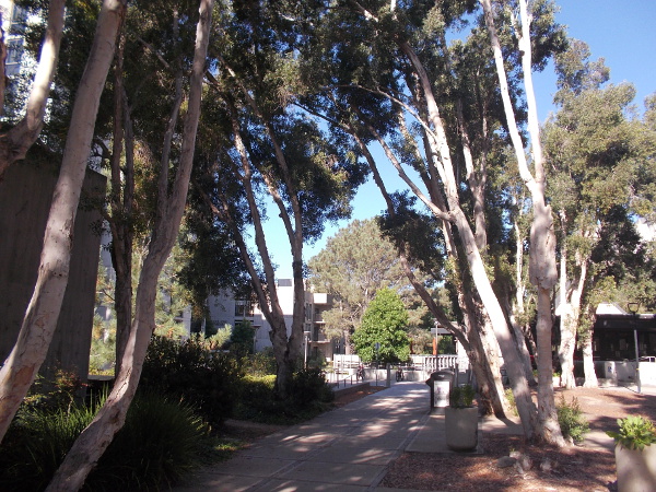 A grove of tall eucalyptus trees near the center of John Muir College, where there's an emphasis on individual study.