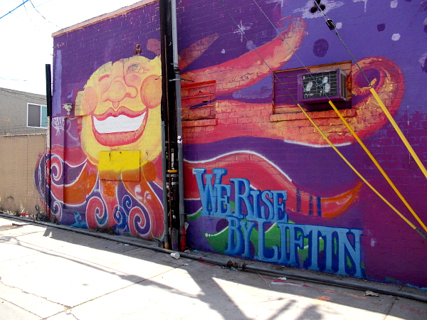 I spied a smiling sun and moon near the intersection of University Avenue and 46th Street in City Heights. The enduring message: WE RISE BY LIFTIN.