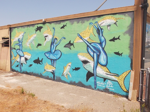 The first photo was taken as I was walking from the Oceanside Transit Center south along Tremont Street. At Wisconsin Avenue I turned west and continued past the “ballerinas among sharks” mural and over the adjacent railroad tracks.
