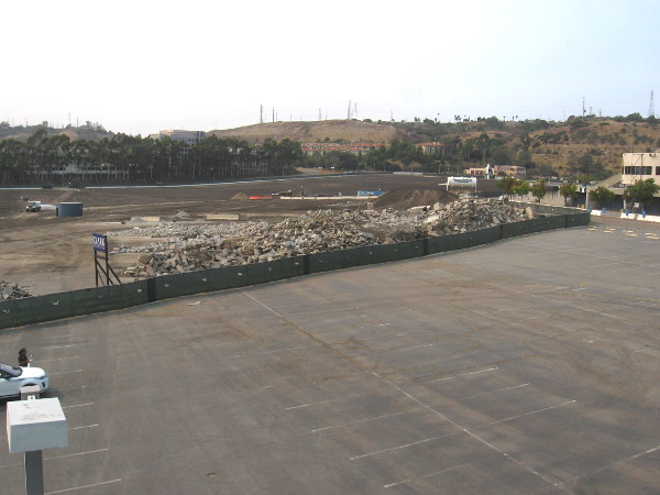 Check out a few photos I took today from a corner of the raised platform at the Stadium trolley station. The west portion of the 120 acre parking lot–once the largest parking lot west of the Mississippi River–is being removed to make way for the “SDSU West” Mission Valley development.