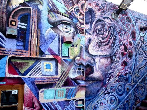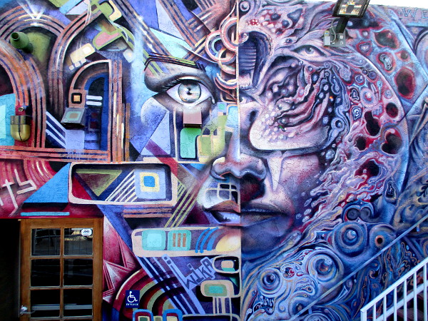 The dazzling abstract face, which appears to me like a joining of the technological and the spiritual, was painted in 2013 by two popular, well-known artists.