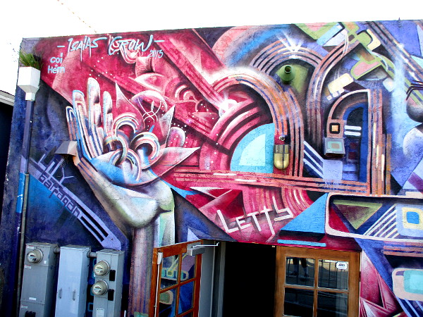 The left half was created by Gibran Isaias Lopez, commonly known as Isaias Crow. His work appears in several places on Cool San Diego Sights. A few weeks ago I posted photos of his incredible mural at Pacific Beach Elementary School here!