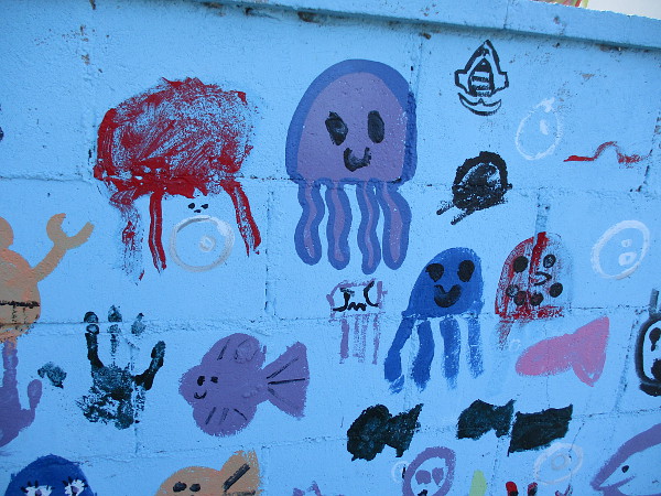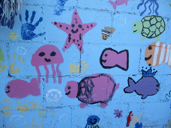 A second, very wonderful mural beside The FRONT’s rear parking area depicts colorful, smiling sea creatures. I learned it was painted years ago by lots of happy kids.