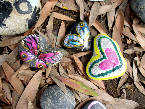 Scattered on dead leaves I found brightly painted butterflies and hearts. I read words expressing love and optimism. I saw painted dreams.