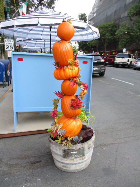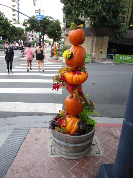 During my morning walk through Little Italy yesterday morning I discovered many towers of pumpkins have risen along India Street. Very creative!