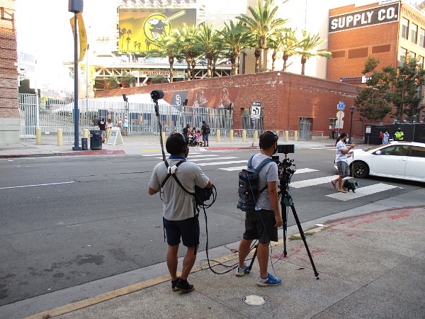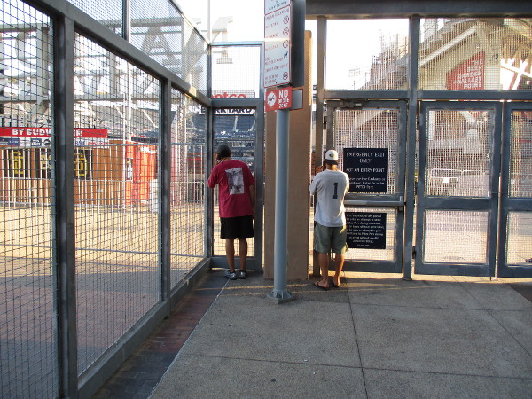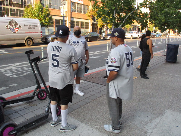 I noticed fans of both the Yankees and Rays had gathered near the ballpark. Some of the fans were trying to peer into Petco Park to watch a little of the action–either live on the field or via the huge video boards. Others were watching the televised game at nearby bars and restaurants. I must say the majority of fans I noticed were rooting for New York. I did see a few Tampa Bay fans, but they were all inside one eatery beyond the reach of my camera…