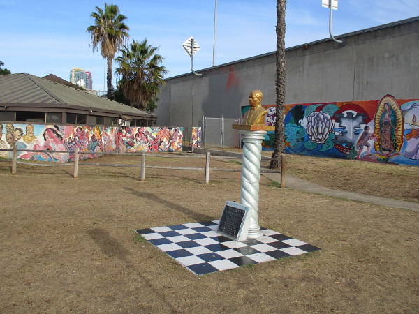 If you walk to the northwest corner of Chicano Park and cross the intersection of Cesar E. Chavez Parkway and Logan Avenue, you’ll see what appears to be a statue on a checkerboard. Move closer and you’ll discover a golden sculpted head on a white pedestal. The bust is of Mexican national hero, Benito Juárez.