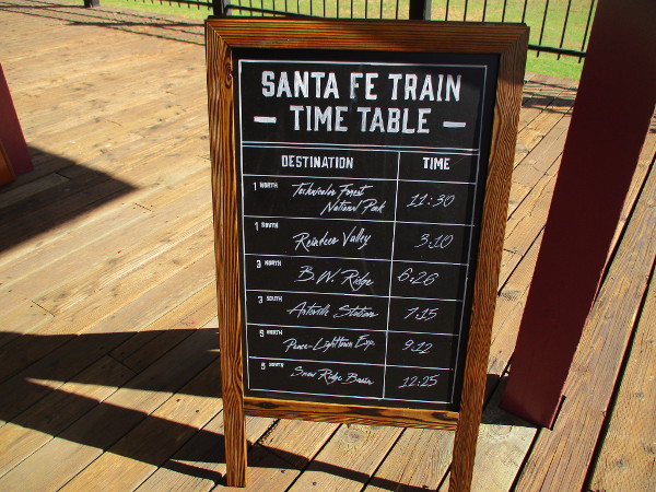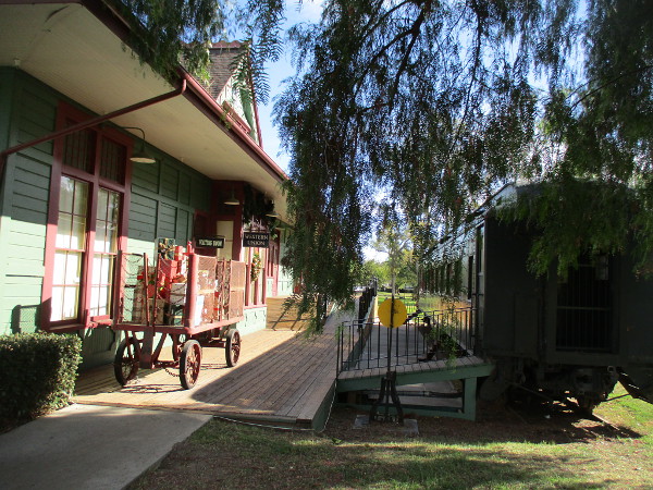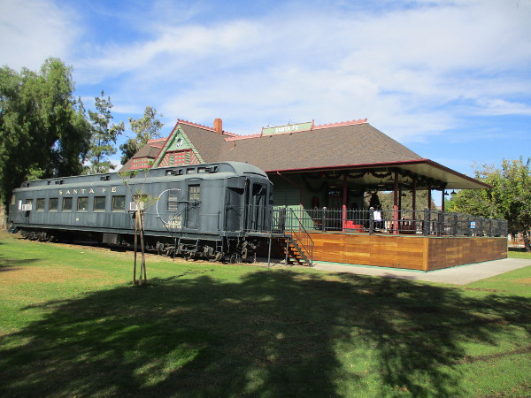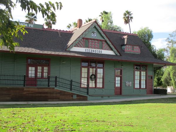 As you can read on one sign that I photographed, the 1888 depot in its heyday “was the nerve center of Escondido, a scene of commercial activity and a social gathering place…The Escondido History Center moved the Santa Fe Depot to Grape Day Park in 1984…”