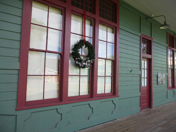 During my daytime stroll through the park, I saw strung lights and Christmas displays and suspended snowflakes and reindeer on the grass that would certainly be very beautiful at night. But my most favorite thing–probably because I like trains–was the historic Escondido Santa Fe Depot and its nearby Pullman Car #92. The holiday decorations at the old railroad station were very unique!