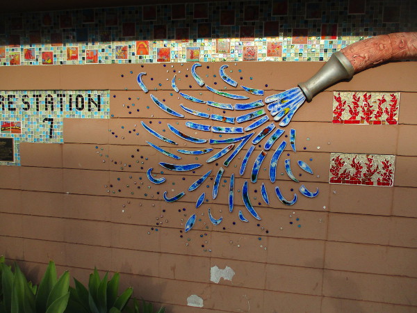 Students attending nearby Perkins Elementary School created this awesome tile mosaic artwork. A sculptural fire hose decorated with firefighting imagery spurts water on burning flames!