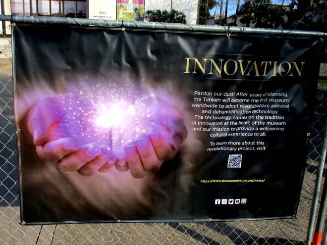 One banner states the Timken will be the first museum in the world to install revolutionary antiviral and dehumidification technology. According to a museum web page, here, this new technology “originally engineered in conjunction with the United States Department of Defense” is considerably more effective at eliminating airborne pathogens than systems presently used in hospital operating rooms!