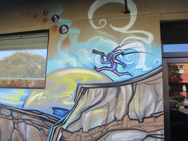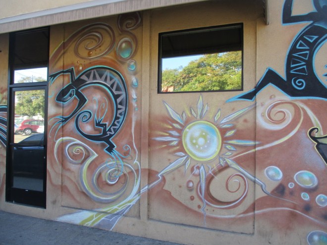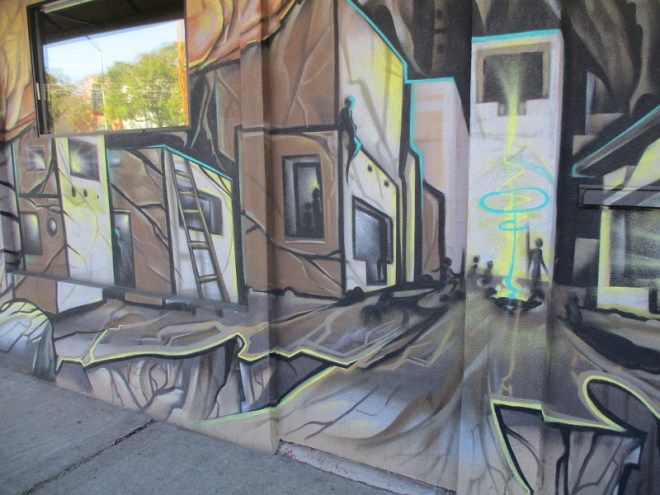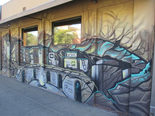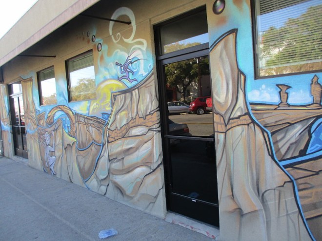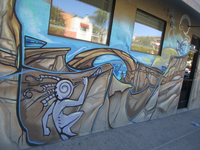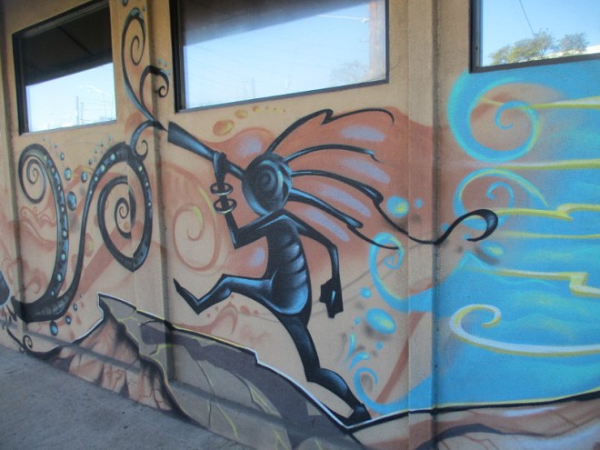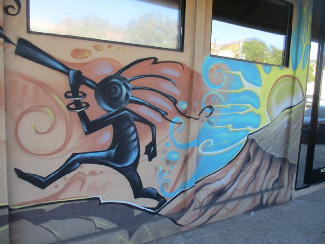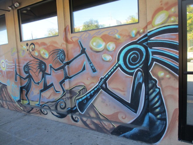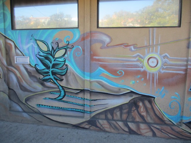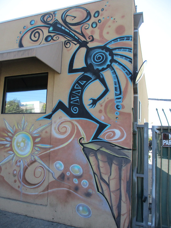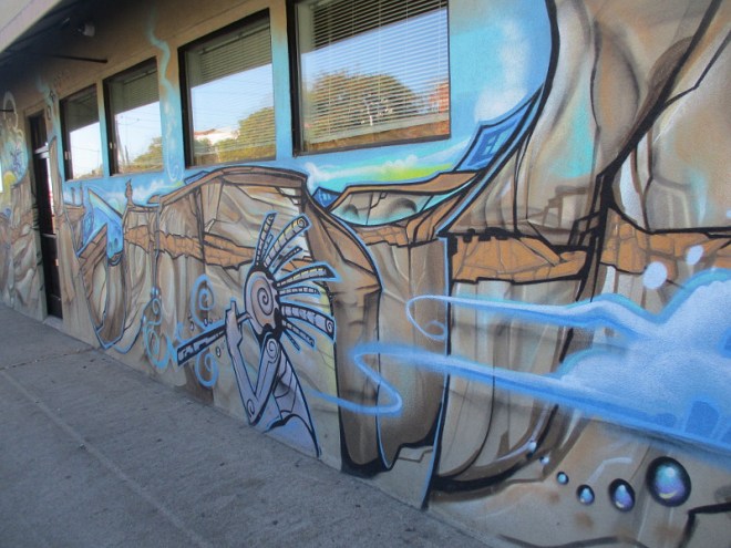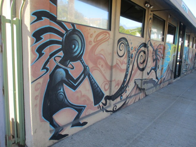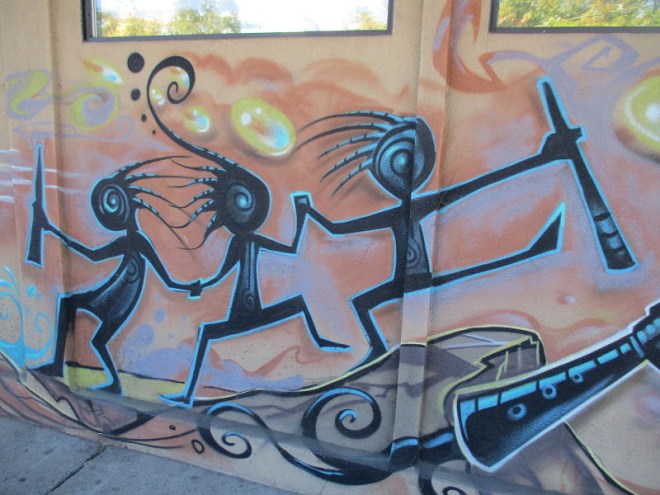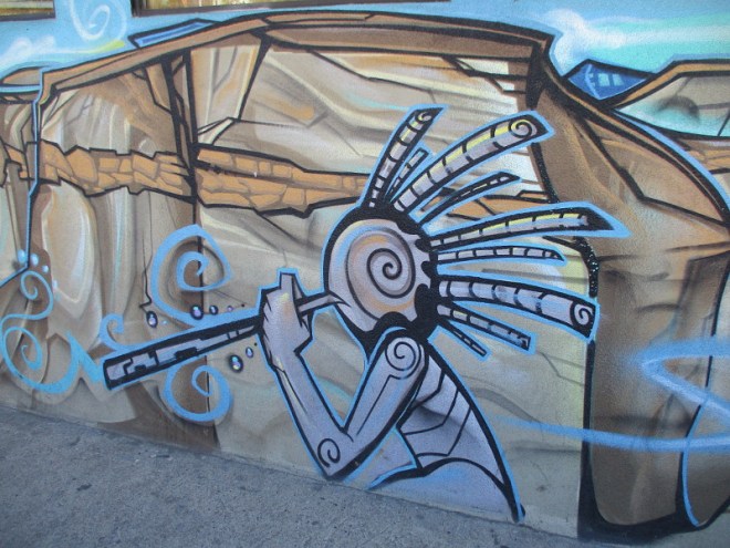 The spray painted art appears to feature Kokopelli, the flute-playing fertility deity from some Native American cultures in the Southwest. The landscapes and dwellings in this mural might indicate the people being portrayed are the Hopi. But I can’t say for certain. I’ve walked past this mural three different times searching for an artist signature, so that I could do more research, but to no avail.