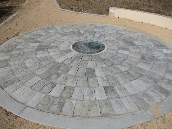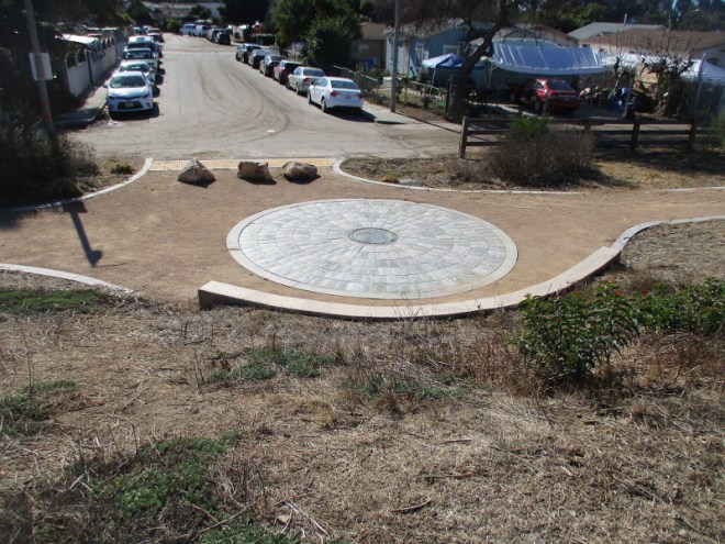As one walks through the neighborhood park, one comes upon a large mosaic-like disk that contains many expressive faces. The public art, made of concrete pavers and bronze set in a small plaza, is titled A Place to Call Home. It was created in 2018 by San Diego artists Ingram Ober and Marisol Rendón-Ober.