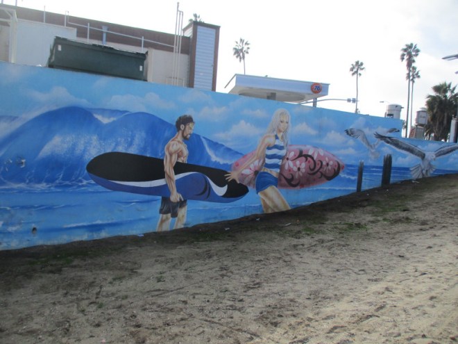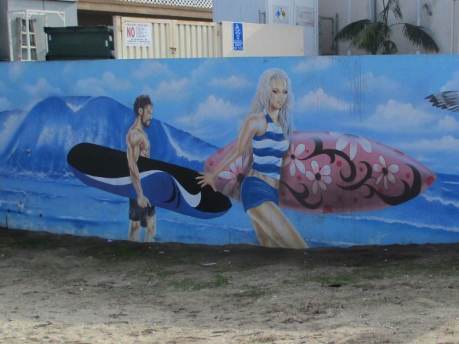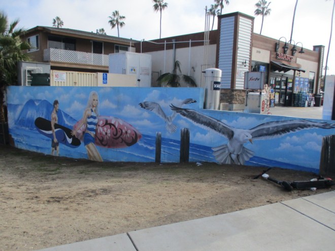 Back in 2015, a mural depicting two surfers and sea birds was painted on both sides of a gas station wall at the entrance to Ocean Beach. You can see it as you drive into OB, at the corner of Sunset Cliffs Boulevard and West Point Loma Boulevard. The eye-catching mural was painted by Southern California artist Henry Goods.