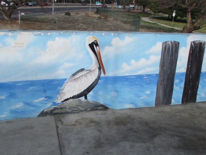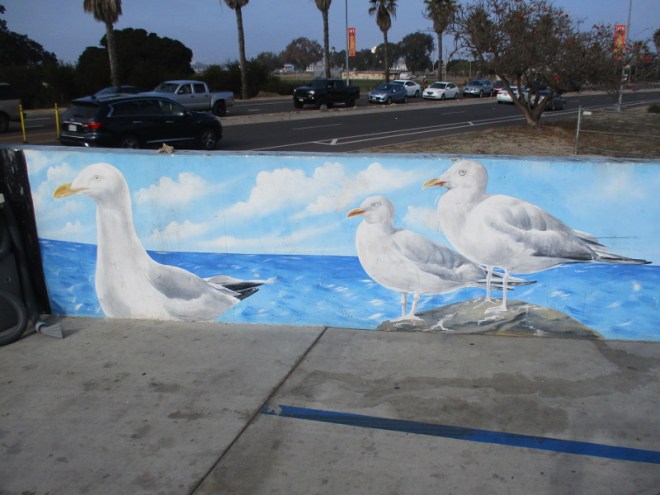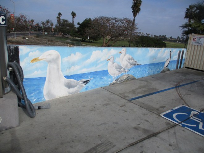 When I read this great article concerning the mural’s creation, I learned another San Diego gas station features more artwork painted by Henry Goods. It’s that long, very colorful mural on First Avenue between Cedar Street and Elm Street, featuring sharks, fish, sea lions and other marine life. I checked out that mural and posted photos here, here and here, over seven years ago when my blog was just getting started!