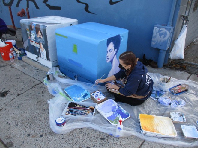 The second utility box is being painted by artist Lucy Helle. Check out her Instagram page here. She also showed me a copy of the original youth art she is working from.