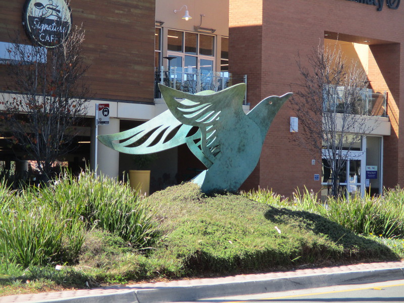 I’m not sure what metal the bird is made of. Other birds on poles stand on the median nearby, which I didn’t photograph this time.