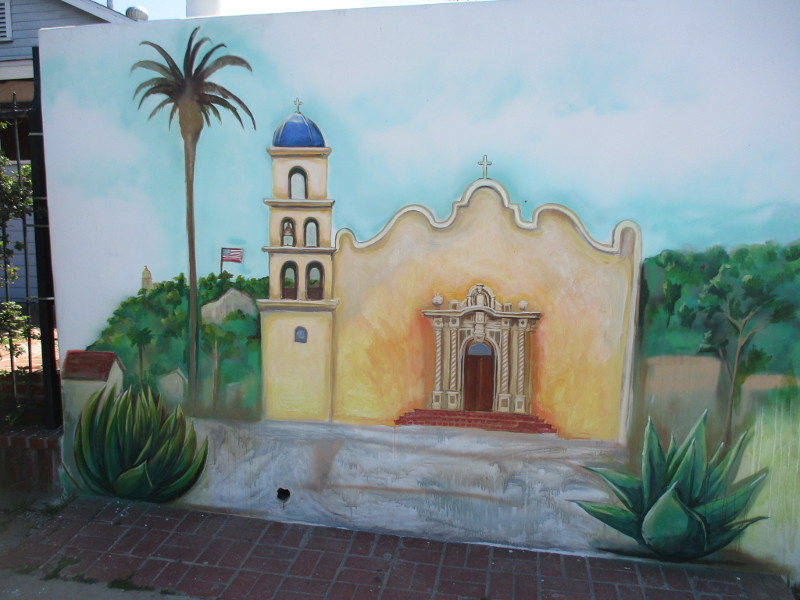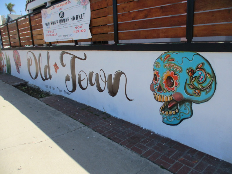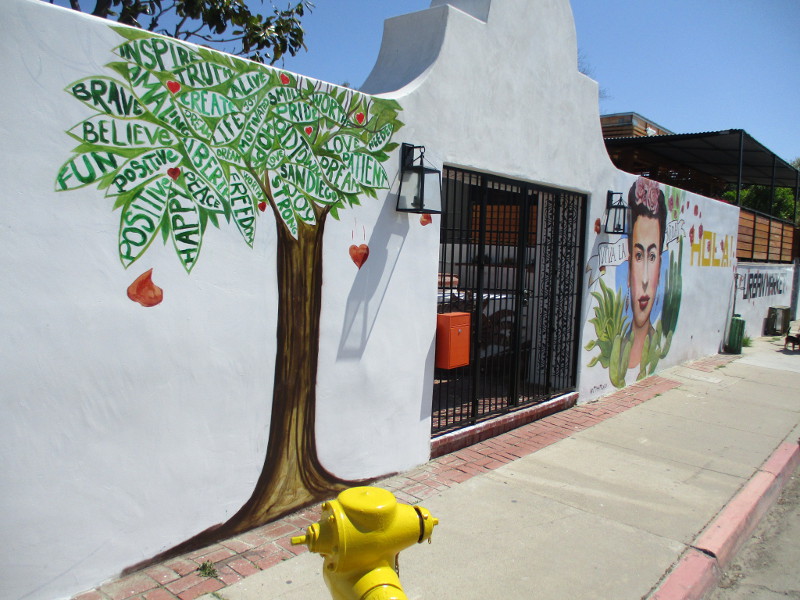 The murals depict Frida Kahlo, a tree full of positive messages, Día de los Muertos imagery, and some of the historical buildings in Old Town San Diego.