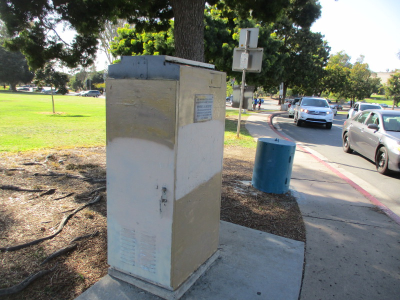 You rarely find a traffic signal box with a special dedication plaque. There’s one such box in San Diego, and it’s located in Balboa Park at the corner of Park Boulevard and Presidents Way.