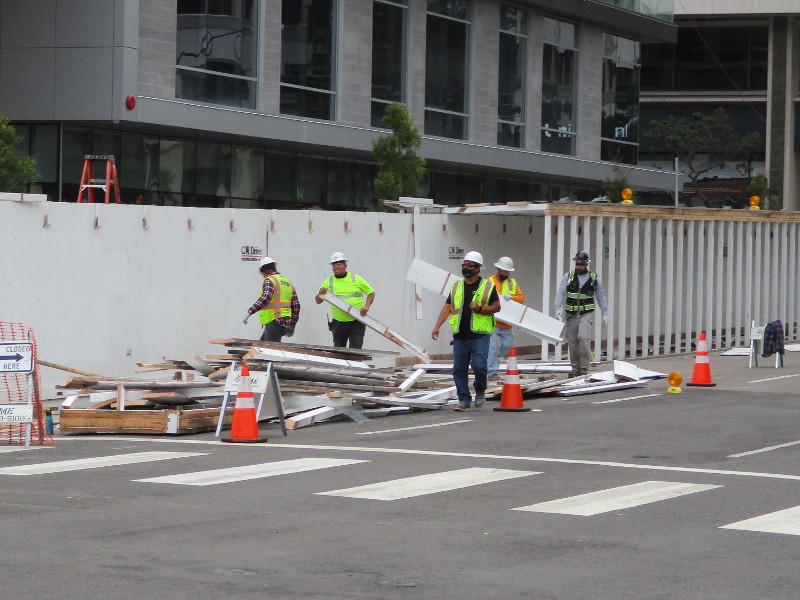 Early yesterday morning, workers were pulling down the construction site fence that surrounds a brand new building in downtown San Diego. The adjacent 20-story 450 B Tower is adding additional office and retail space in the heart of the city.