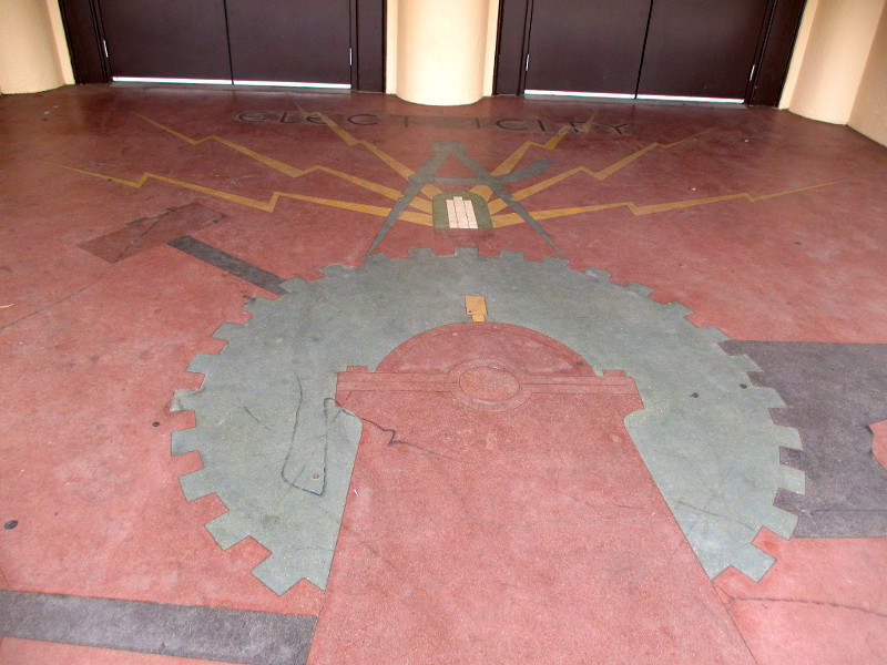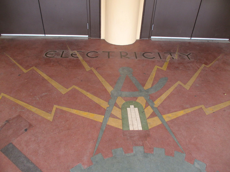 The Palace of Electricity and Varied Industries building–today’s gymnasium–still retains an indication of its unique origin. Look down as you approach the front door and you’ll see this artwork in the entry…