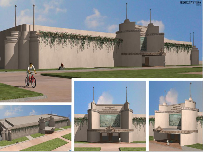 Several architectural visualizations show how Balboa Park’s Municipal Gymnasium will appear once the panel is installed. Grand ornamental flourishes will crown both the building’s entrance and panel. Compare the following images.