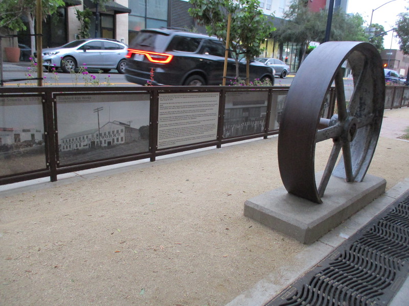 Part of one sign I photographed reads: “…Entrepreneur and businessman Bob Sinclair valued the history and architecture of the East Village. During the 1970’s through the 1990’s he acquired historic buildings and collected industrial artifacts from the old workshops…His businesses were often located in historic buildings, and he filled the warehouses he bought with new industries. The Hazard, Gould, and Company Buildings at 7th Avenue and G Street, Wonder Bread Warehouse at 14th and L Streets, Rosario Hall at 13th and J Streets, and the Broom Works Factory and Wheelworks Building on J Street between Park Boulevard and 13th Street are examples of historic properties owned by Bob Sinclair…”