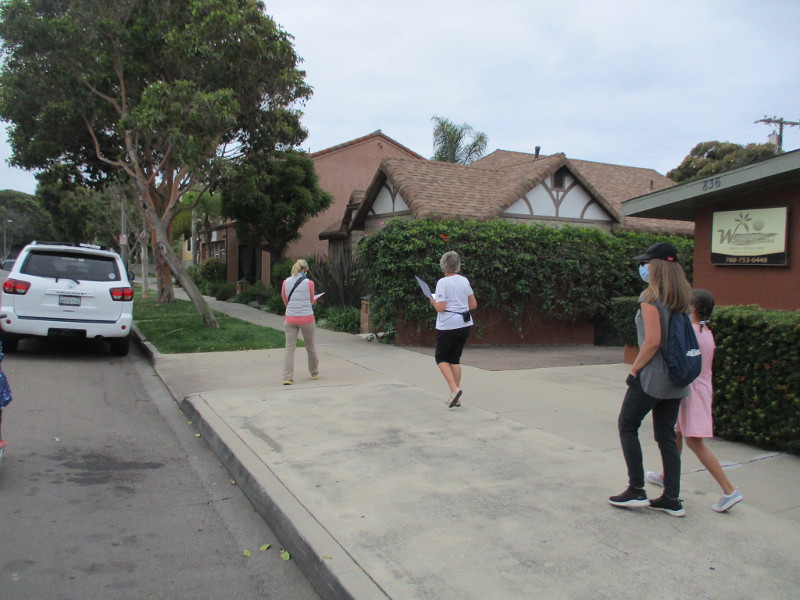 Our group headed south from the schoolhouse, checking out the two iconic Encinitas Boathouses and a few other historical homes and buildings. After a short eastward leg, we continued farther south down Coast Highway 101 to view the Golden Lotus Towers of the Self-Realization Fellowship from a distance, then headed back north passing numerous historical buildings until we reached Cottonwood Creek. Turning west, we followed the creek, climbed to a spot overlooking Moonlight Beach where we admired a Heritage Tree, then headed south a few blocks back to the old schoolhouse.