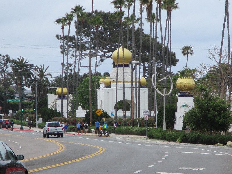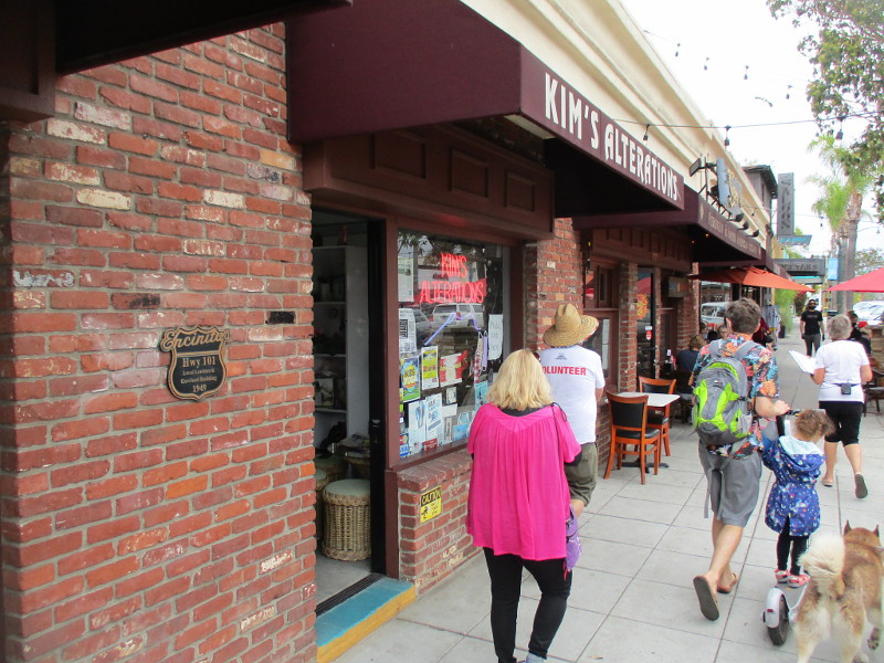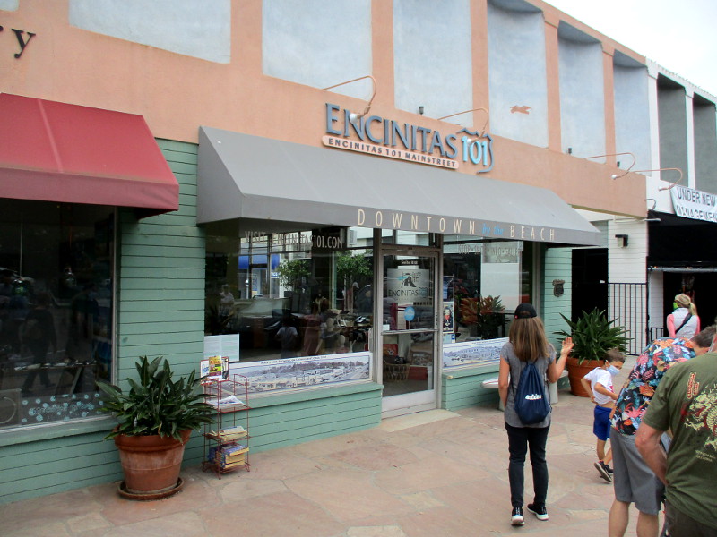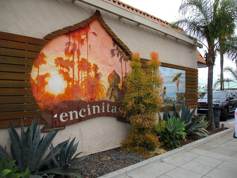 The unique Boathouses of Encinitas were built in 1927-1928 and were once called The Arks. They were constructed with recycled lumber from a dance pavilion and bath house that used to be located at Moonlight Beach.The Petrie House, in the Tudor-Cotswold Revival architectural style, was built in 1931. Every cement block was made by hand.The Self-Realization Fellowship Temple was originally the 1916 Mission School. The old Spanish architectural influences are still visible.To the south down Coast Highway 101 we could see the distinctive golden towers of the Self-Realization Fellowship ashram.The 1949 County Realty Building, now home of Encinitas 101 Main Street Association.A surfboard bench and photo of Main Street, Encinitas, California, looking west, circa 1947.Beautiful wood interior of the 1925 Payne Cleaners building. It is home to the longest laundry service business in San Diego County.Rustic-appearing buildings across the Coast Highway at The Lumberyard shopping center were inspired by history. Trains running on nearby tracks once delivered lumber to Encinitas here.Beautiful original glasswork decorates a historic building.The Daley Double saloon was called the Rendezvous in the 1930’s. It once housed an illegal poker parlor and boxing ring.Murals painted by Micaiah Hardison, born and raised in Encinitas.The original Encinitas sign was erected in 1928, removed in 1937 for a highway widening project, then duplicated and returned to the same location in 2000.The famous La Paloma Theater, also called Aubrey Austin Building, opened in 1928. Built in a Spanish Mission/Art Deco style.The sculpture Encinitas Child was created by local artist Manuelita Brown. A young girl was killed on the nearby road years ago.The popular, very colorful Surfing Madonna mural.