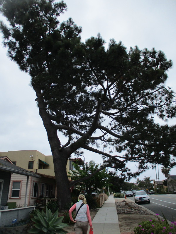 Encinitas owes its origin to Cottonwood Creek, a source of water and wood on San Diego’s arid north coast. Trains coming down from Los Angeles stopped here. In 1881 the town of Old Encinitas was established.Members of our tour group look down at a huge frog at the edge of the creek.A large, rare Torrey pine tree, on a hilltop not far from the Pacific Ocean.The 2nd Heritage Tree of Encinitas. Planted in 1952, the huge Star Pine is lit during the holidays and Santa arrives on a firetruck from nearby Fire Station One.One of many quaint beach cottages built by the ocean in Encinitas.