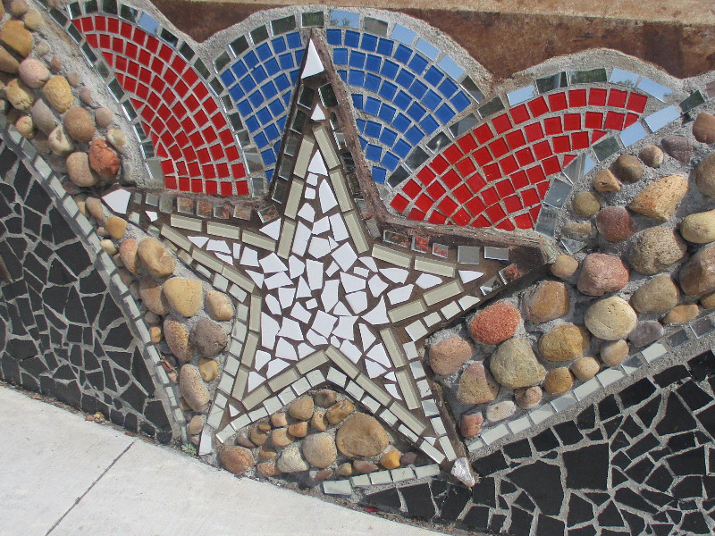 In the center of the roundabout I discovered five medallion-like plaques that honor five branches of the United States Armed Forces. But what really caught my eyes were the colorful red, white and blue star mosaics that decorate several walls surrounding the intersection!