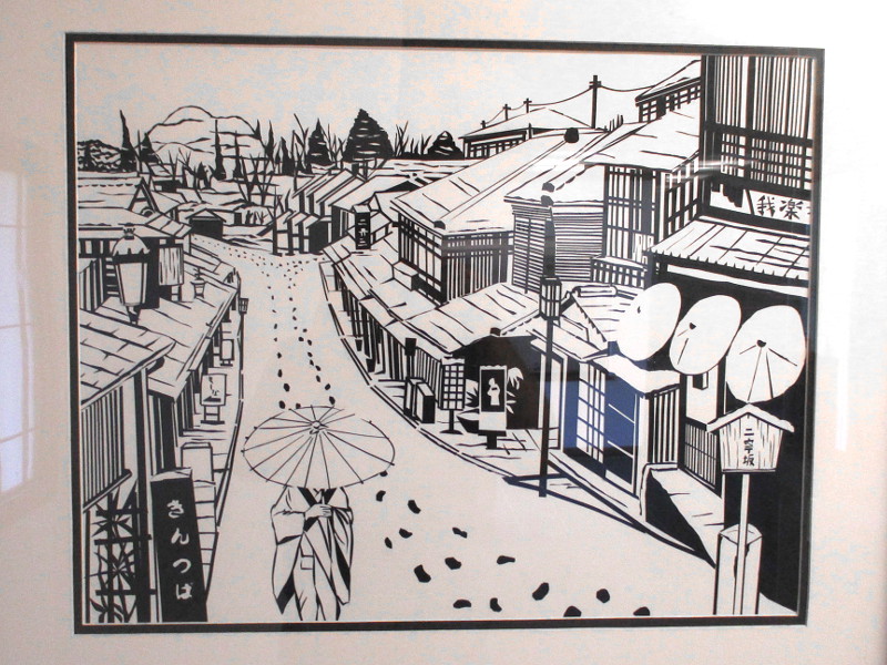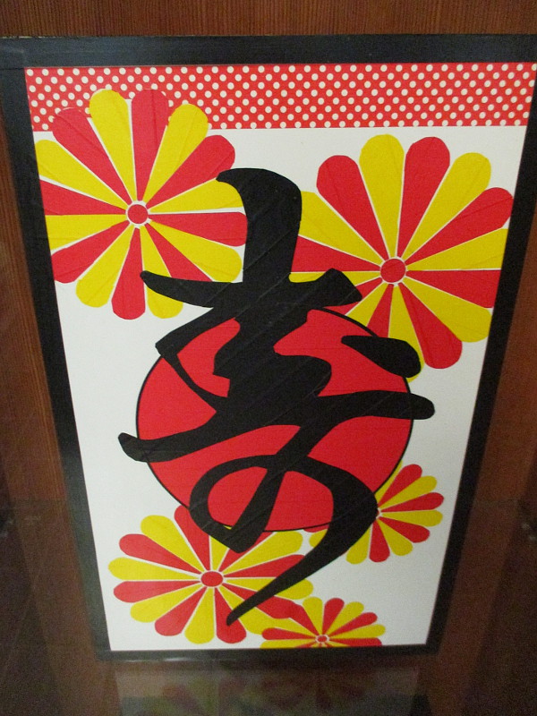 Some of the works on display depict daily life in Japan. Some appear like colorful Hanafuda, a style of Japanese playing cards. A few of her works, including a piece that is quite large and striking, concern the horror of Hiroshima at the end of World War II, and make an appeal to the viewer for peace.