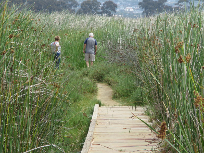 Here and there through dense bulrushes, or at viewing platforms, one can see the placid lagoon, and birds floating in the water or taking flight. Not only does local wildlife depend on this important natural habitat, but Buena Vista Lagoon is used by thousands of migrating birds that follow the Pacific Flyway.