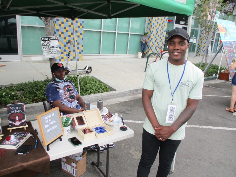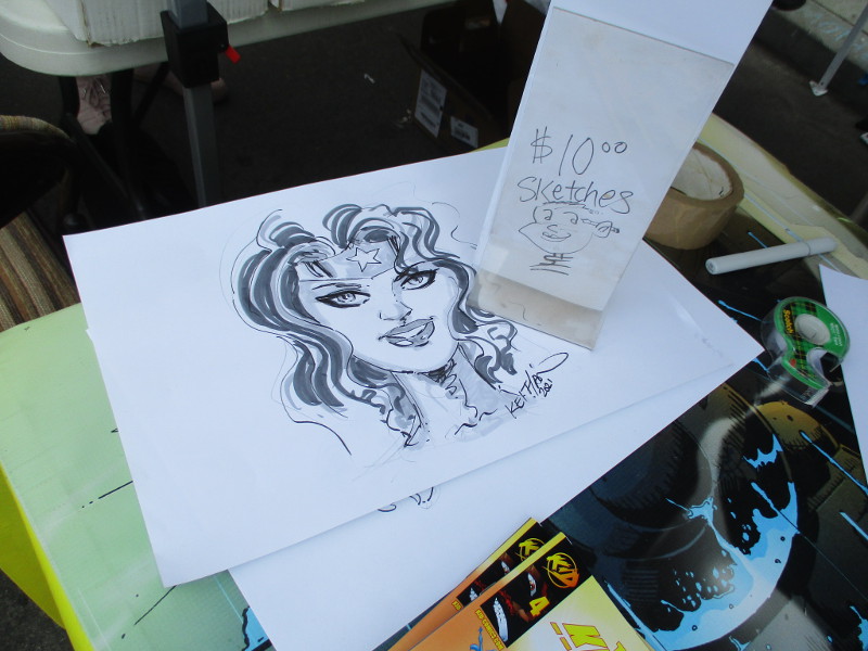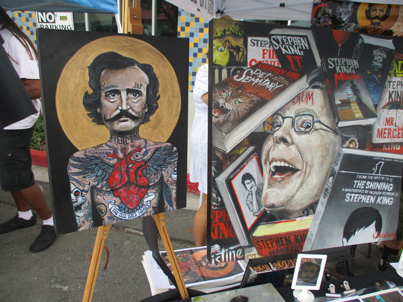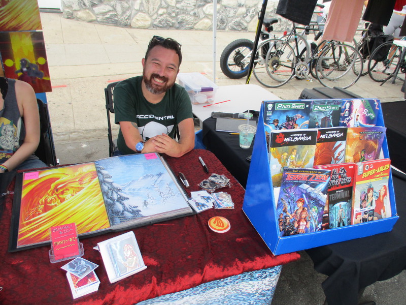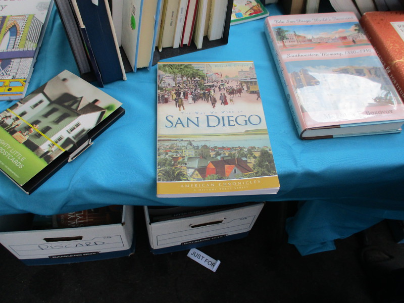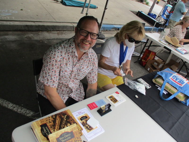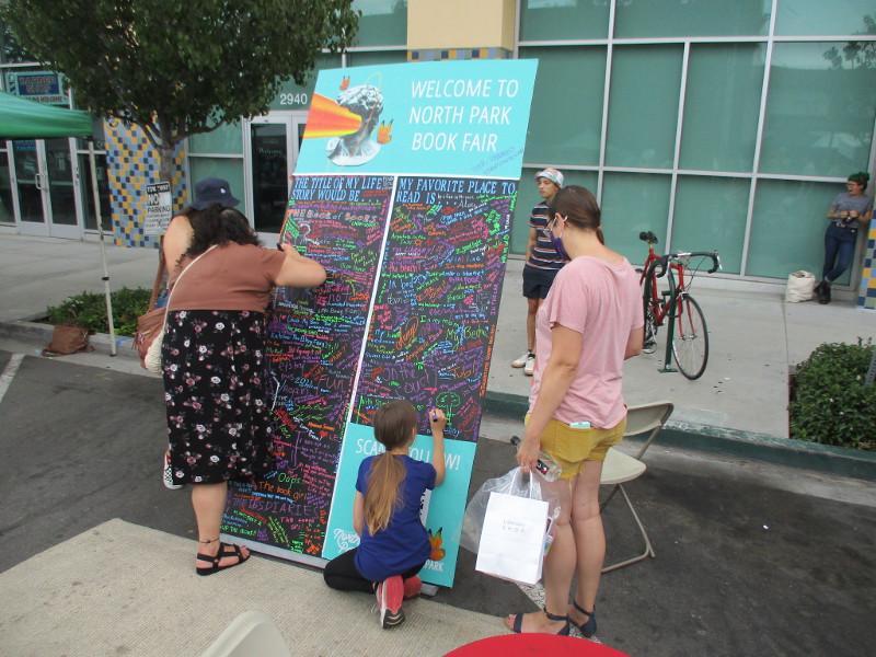 Not only was there live painting, local authors and small presses, but one could enjoy poetry readings, storytelling for kids, and perusing thousands of books for sale! And food, too!When I reported the street was packed, I wasn’t kidding!A friendly North Park Main Street volunteer smiles for a pic. Thanks for the great event!The San Diego Public Library had tables full of used books for sale.Friends of the San Diego Public Library smile! I’ve purchased oodles of used books at the Central Library over the years.I almost bought this book about San Diego. I have too much to read, already.Kids could draw fun comic panels at the Little Fish Comic Book Studio booth.Keithan Jones of KID Comics smiles. Look at all the cool independent comic book art he created!He did this great Wonder Woman sketch!I listened for a while as poets presented their words to the gathered crowd.Live poetry at the North Park Book Fair! This animated poet received big applause!A smile from an Accidental Aliens writer!Smiles from two Accidental Aliens artists!Beatrice Zamora wrote award-winning children’s book The Spirit of Chicano Park. She’ll be dancing at the big Danza event at Chicano Park tomorrow!Book, books, books everywhere!Armando Elizarraras created some very cool artwork based on portraits of famous authors. Check out his tattooed Edgar Allan Poe with The Tell-Tale Heart!MORE. LESS. etc. Three sequential books by artist, author and poet Ted Washington! Can poems include mathematical formulas?The folks of Write Out Loud were at the North Park Book Fair, presenting this fun, fishy Kamishibai street theatre story!Book fair goers could indicate with chalk the place where they most like to read…In bed, on the toilet, by the pool, at the beach, with a cat . . . or anyplace!The smile of superhero creator @boypoetic!Tamra L. Dempsey took photographs for the beautiful book A Journey Through Literary America! It includes literary passages by famous authors.One smile and one semi-smile. It’s all good. Keep on creating!Cynthia Diamond wrote all these Wyrd Love books. I remembered seeing her years ago at a big Liberty Station book event!Douglas W. Mengers wrote a book about San Diego Trolleys. I learned some interesting history when we chatted.This book contains lots of old images of rail transportation in San Diego.Lots to see and do at the North Park Book Fair!