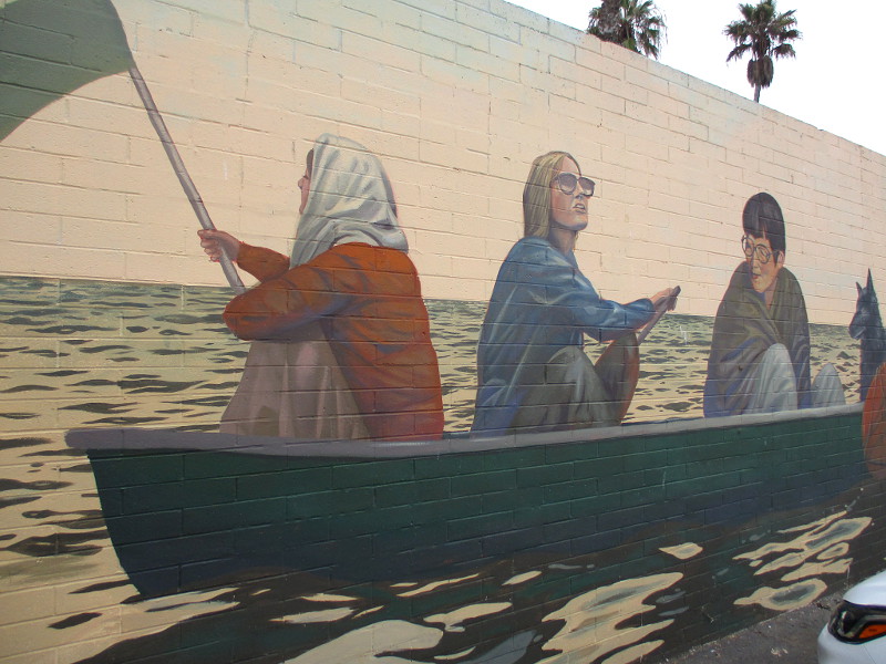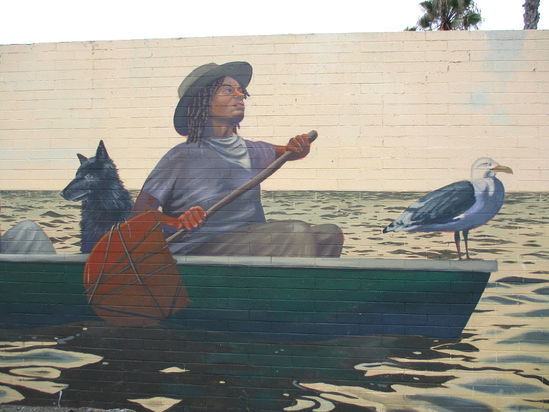 Next to the mural I found an article printed in the Point Loma-OB Monthly concerning the artwork and its creation. You can read the article online here. The four women in the canoe form a racially diverse group. If there’s a basic message in the mural it’s that Ocean Beach is a diverse and welcoming community.