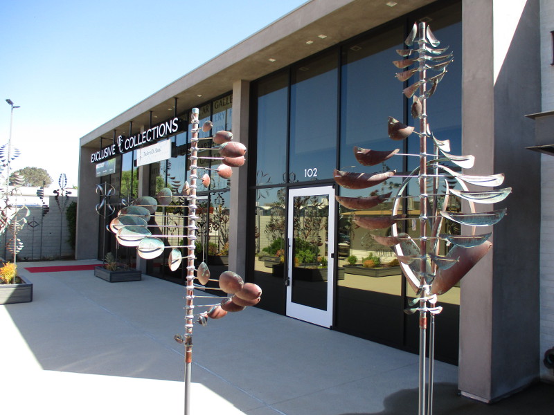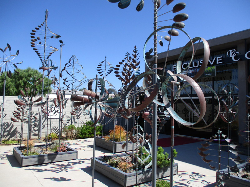 I was walking on Sunday through the Cedros Avenue Design District in Solana Beach when my eyes were drawn by twirling, whirling movement tucked between two buildings. I had stumbled upon a fantastic garden of kinetic wind sculptures at the Exclusive Collections Gallery!
